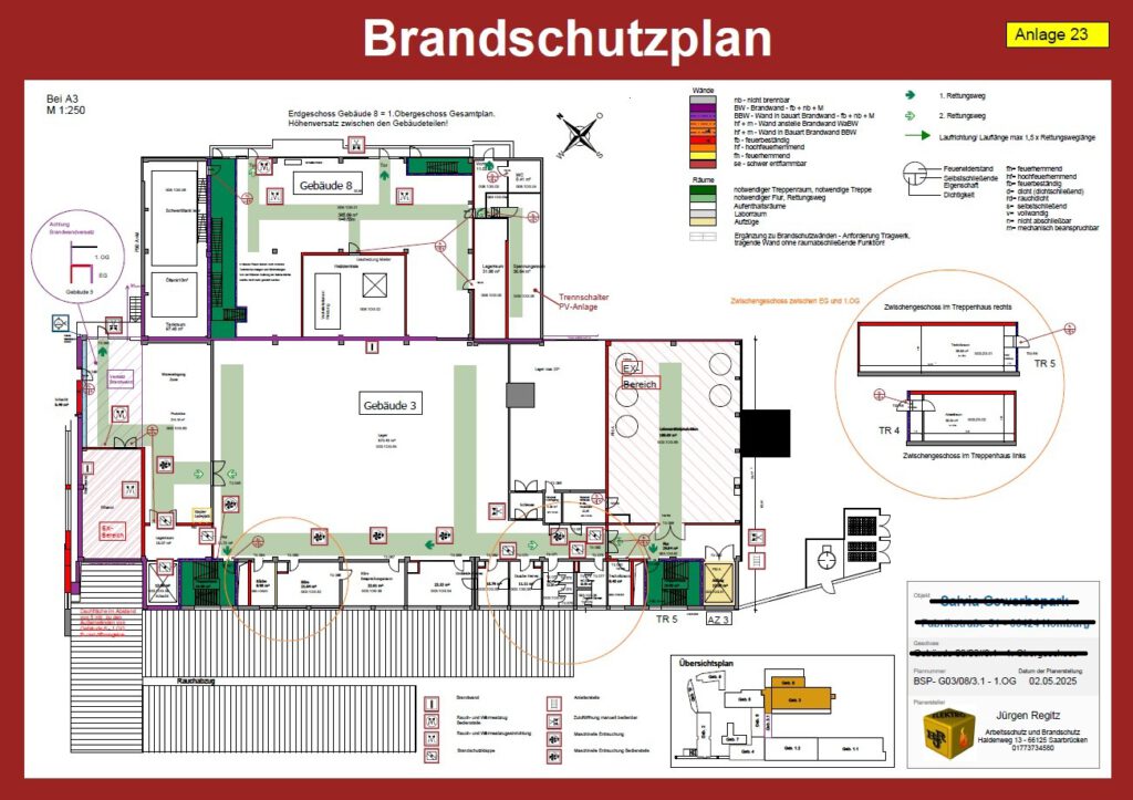 - Inhalt: Darstellung von Rettungswegen, Brandabschnitten, raumabschließenden Bauteilen (Wände, Türen) und technischen Einrichtungen wie Brandmeldern.